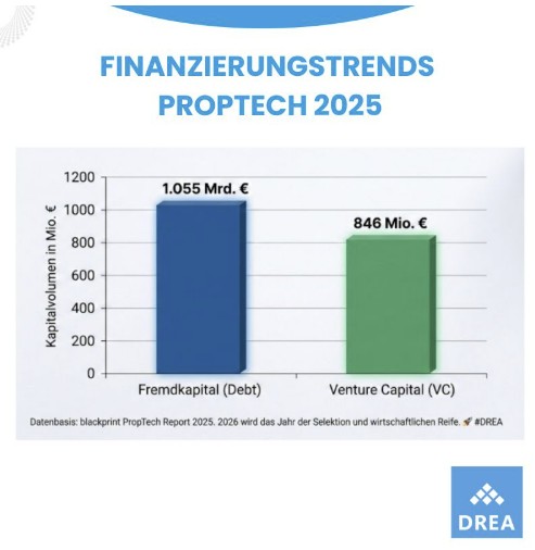 2️⃣ „Debt schlägt Equity“: Ein Paukenschlag bei der Finanzierung! Während das Venture Capital (VC) mit 846 Mio. € rückläufig ist, hat sich Fremdkapital (Debt) mit 1,055 Mrd. € als der wahre Skalierungstreiber 2025 etabliert. PropTech ist kein reines VC-Spiel mehr, sondern fester Bestandteil der realen Infrastruktur- und Bestandsfinanzierung.